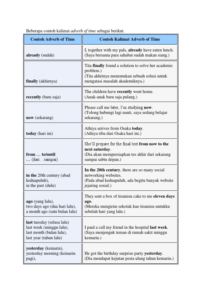 Contoh kalimat kalimat menggunakan adverbial clause of time. Jika ada lebih dari satu kata adverb di dalam suatu kalimat kita perlu mengikuti aturan adverb order. Adverb of time sangat mudah dijumpai dalam sebuah kalimat bahasa inggris. Adverbial clause of time. Ira went to police office yesterday ira pergi ke kantor polisi kemarin three years ago my brother got married tiga tahun lalu. The teacher comes daily guru datang setiap hari.