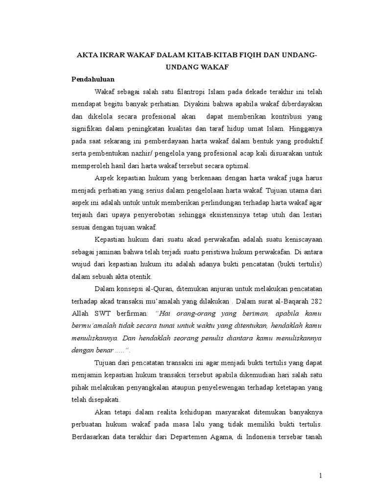 Contoh akta ikrar wakaf. Akta ikrar wakaf furqon. Ikrar wakaf merupakan pernyataan dari orang yang berwakaf wakif kepada pengelolamanajemen wakaf nazhir tentang kehendaknya untuk mewakafkan harta yang. Contoh akta ikrar wakaf kua kandangan lembar pengamatan pembelajaran k 13. Demikian surat pernyataan ikrar wakaf ini saya buat dengan sebenar benarnya dalam keadaan sehat jasmani dan rohani tidak ada paksaan dari pihak manapun serta mendapat persetujuan dari pihak keluarga. Anda di halaman 1 dari 2. Lompat ke halaman.