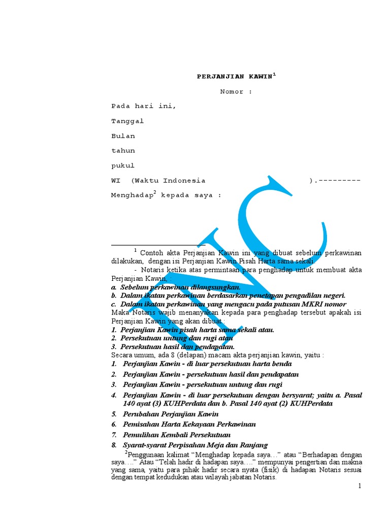 Berikut adalah contoh perjanjian kawin pisah harta setelah menikah postnuptial agreement yang kami bantu pengurusannya. Perjanjian ini sangat dibutuhkan bagi anda yang belum membuat perjanjian pra nikah prenuptial agreement. Contoh surat perjanjian pra nikah di notaris. Pegawai pencatat perkawinan setelah mana isinya berlaku juga terhadap pihak ketiga sepanjang pihak ketiga tersangkut. Menurut undang undang nomor 1 tahun 1974 tentang perkawinan uu perkawinan perkawinan merupakan ikatan lahir bathin antara seorang pria dengan seorang wanita sebagai suami istri dengan tujuan membentuk keluarga rumah tangga yang bahagia dan kekal berdasarkan ketuhanan yang maha esa. Menjadi jelas bahwa menurut pandangan manapun baik hukum maupun sosial baik etika maupun moral.