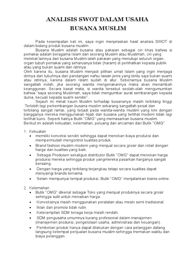 Analisis swot dalam usaha busana muslim pada kesempatan kali ini saya ingin menjelaskan hasil analisis swot di dalam bidang produk busana muslim. Dalam konteks organisasi bisnis usaha ataupun kepribadian diri kita memiliki tujuan tujuan yang ingin dicapai.