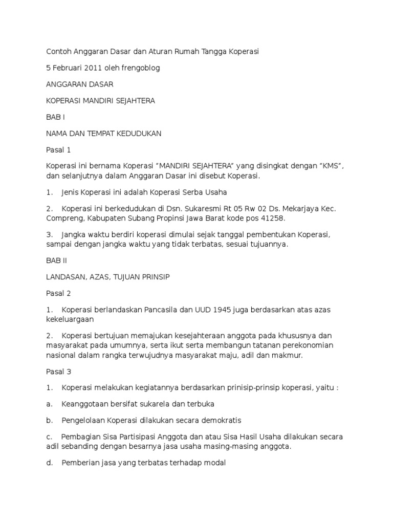 Koperasi ini berkedudukan di dsn. Manager pegawai koperasi karyawan dalam menjalankan tugas dan kewajibannya dibuatkan. Menyetujui isi anggaran dasar anggaran rumah tangga dan ketentuanperaturan khusus lainnya yang berlaku di koperasi. Dipecat oleh pengurus karena tidak melaksanakan atau mengindahkan kewajiban sebagai angggota koperasi atau karena berbuat yang merugikan koperasi baik keuangan maupun nama baik koperasi. Bahwa saya dalam menjalankan tugaskewajiban sebagai pengurus koperasi akan selalu berpegang teguh pada ketentuan undang undang koperasi dan peraturan pelaksanaannya anggaran dasaranggaran rumah tangga serta peraturanperaturan yang berlaku pada koperasi melaksanakan ketentuanketentuan tersebut dengan jujur dan sebaik baiknya. Dalam posting ini saya sertakan contoh anggaran dasar dan anggaran rumah tangga koperasi tetapi perlu diingat organisasi koperasi tidak serta merta bisa mengcopt paste begitu saja secara mentah ada bagian bagain sensitif yang harus diperhatikan misalnya tempat dan atribut organisasi persyaratan anggota dan pembagian shubisa jadi shu dibagi tidak dengan persentasi seperti didalam contoh.