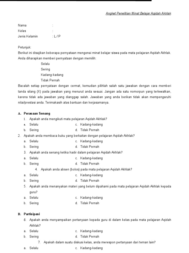 Contoh angket penelitian pendidikan. Contoh angket penelitian berikut ini rangkuman materi tentang angket penelitian yang dibahas mulai dari pengertian fungsi strukturunsur jurnal tujuan ciri makalah makna konsep kutipan angket penelitiansecara lengkap. Home pendidikan contoh angket penelitian pelajaran bahasa indonesia. Angket kuesioner adalah metode pengumpulan data yang dilakukan dengan cara memberi seperangkat pertanyaan atau pernyataan tertulis kepada respondenangket diisi oleh responden sesuai dengan yang dia kehendakiketahuirasakan. Tes instrumen afektif pada pengembangan alat ukur pengembangan instrumen afektif mencakup. Dalam hal ini yang perlu diukur adalah sikap dan minat terhadap pelajaran. 9 contoh rumusan masalah pendidikan penelitian proposal skripsi karya ilmiah 13 contoh slip gaji karyawan perusahaan swasta guru pns sederhana excel kumpulan contoh metode penelitian pengertian jenis metode tujuan kualitatif 27 contoh paper singkat sederhana penelitian kuliah cara membuat 31 contoh kata pengantar makalah laporan skripsi tugas praktikum proposal 21.
