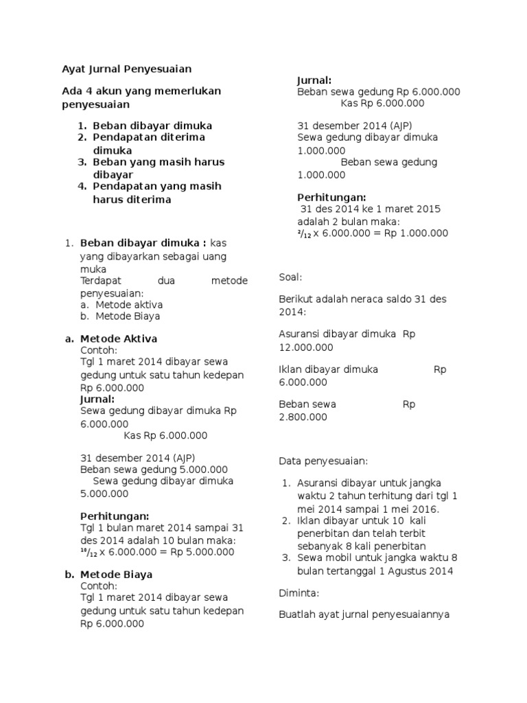 Contoh ayat jurnal penyesuaian. Debit beban penyusutan rp 50000. Akun beban yang memerlukan penyesuaian karena ada beban yang belum diperhitungkan atau pembayaran yang belum menjadi beban. Pengertian ayat jurnal penyesuaian adjusting journal entry adalah yaitu ayat jurnal yang dibuat untuk menyesuaian saldo saldo rekening yang ada di neraca saldo menjadi saldo yang sebenarnya sampai dengan akhir periode akuntansi. Tujuan ayat jurnal penyesuaian untuk mengoreksi perkiraan perkiraan yang ada sehingga mencerminkan keadaan aktivautangmodalpendapatan dan biaya yang sebenarnya. Contoh penulisan jurnal penyesuaian. Estimasi besarnya penyusutan untuk bulan maret 2019 diasumsikan rp 50000.