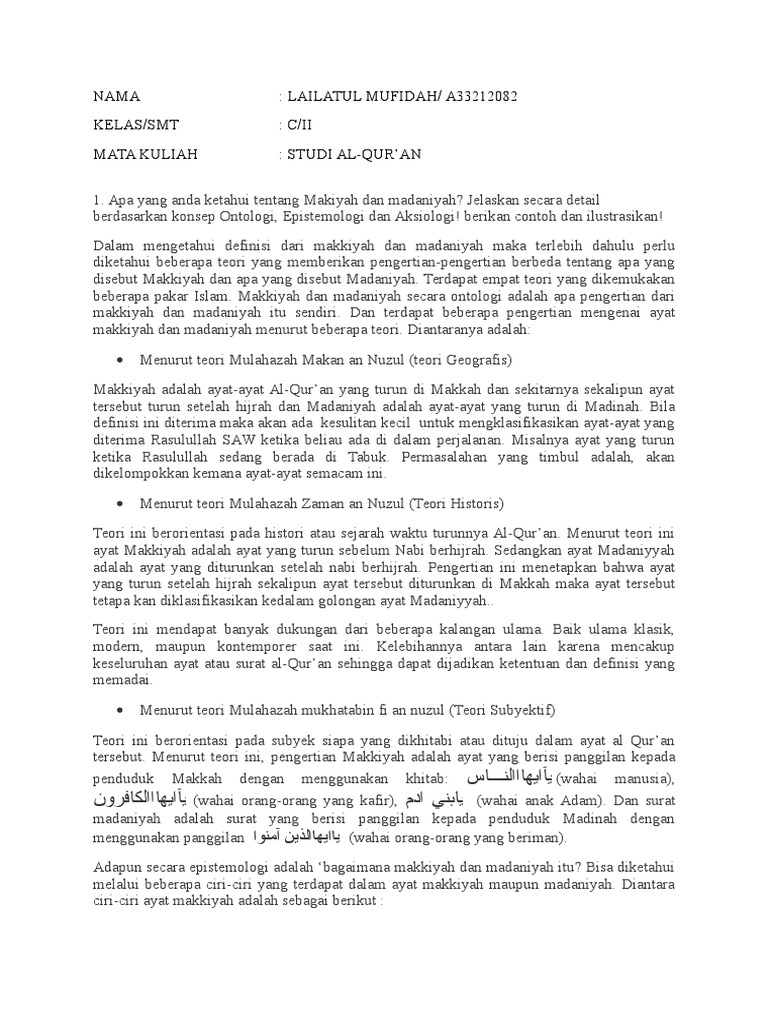 Contoh ayat makkiyah dan madaniyah. Adapun pendefinisian makkiyah dan madaniyah dari perspektif tema pembicaraan akan disinggung lebih terinci dalam uraian karakteristik kedua klasifikasi tersebut. Jadi penamaan surat makkiyah dan madaniyah didasarkan pada sebagian besar ayat yang terkandung di dalamnya. Perbedaan ayat makkiyah dan madaniyah. V diantara ciri yang paling tampak dari ayat makkiyah adalah ayat ayatnya banyak berisi tentang ajakan kepada tauhid dan beribadah hanya kepada allah pembuktian mengenai risalah kebangkitan dan hari pembalasan hari kiamat dan kengeriannya neraka dan siksaannya surga dan nikmatnya argumentasi terhadap orang musyrik dengan menggunakan bukti bukti rasional dan ayat ayatkauni ah disamping. Pada umumnya surah surah makkiyah mudah dihafal karena ayat ayat pendek sedangkat sebaliknya pada surat madaniyah ayat ayatnya terlalu panjang. Di kalangan ulama terdapat beberapa pendapat tentang kriteria untuk menentukan m akkiyah atau m adani y ah suatu surat atau ayat.