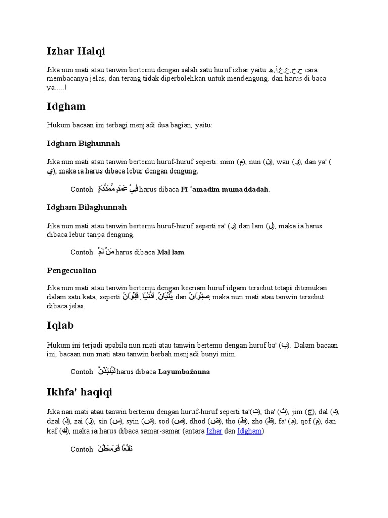 Idgham bighunnah adalah salah satu hukum bacaan tajwid nun mati dan tanwin dalam membaca al quran selan idzhar iqlab dan ikfa. Setelah kalian sudah cukup memahami tentang pengertian idgham bighunnah dan cara membaca bacaan idgham bighunnah diatas yang mendengung maka dibawah ini telah penulis berikan contoh idgham bighunnah secara sederhana dan yang ada di ayat ayat al quran. Dalam mempelajari ilmu tajwid anda harus sering membaca dan memperhatikan satu persatu hurufnya dengan tertib dan. Bacaan tajwid idham ada 2 yaitu idgham bigunnah dan idgham bilagunnah pengertian idgham. Contoh bacaan idgham bilaghunnah mari kita lanjutkan pembahasan ilmu tajwid tentang hukum bacaan nun sukun dan tanwin. Tulisan aslinya adalah lathii fun li maa tetapi dibaca lathii fulli maa قلي ل ل يصبح.