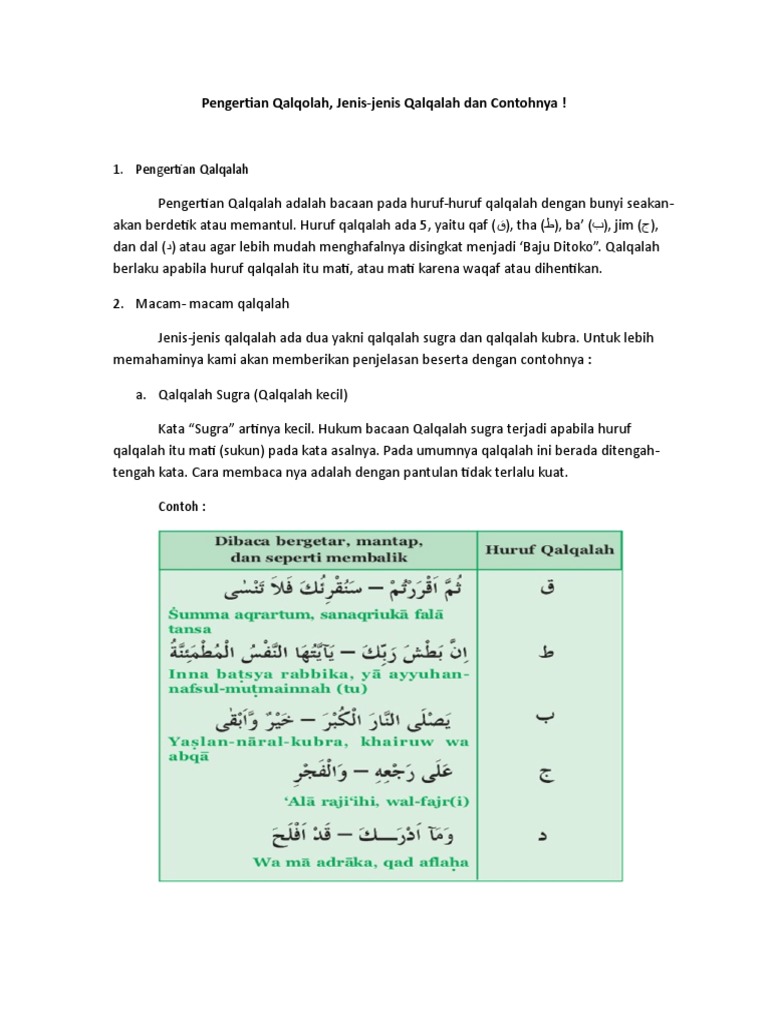 Dalam keadaan ini qalqalah dilakukan apabila bacaan diwaqafkan tetapi tidak diqalqalahkan apabila bacaan diteruskan. Qalqalah bisa dibagi menjadi yaitu sughro dan kubro. Pengertian qalqalah pada saat kita membaca kitab suci al quran tentu tidak terlepas dengan hukum hukum bacaan dan tanda tanda waqaf disetiap ayat dalam al quran. Berikut adalah contoh contoh hukum bacaan. Untuk mengingat kembali pelajaran tajwid tentang pengertian dan macam macam qolqolah di sekolah tidak ada salahnya jika saya share kepada sahabat sekalian di blog ini meskipun sudah ada yang mengshare sebelumnya. Jadi bedaqalqalah kubra lgsg memantul dan qalqalah akbar agak ditahan sdkit lalu dipantulkan.
