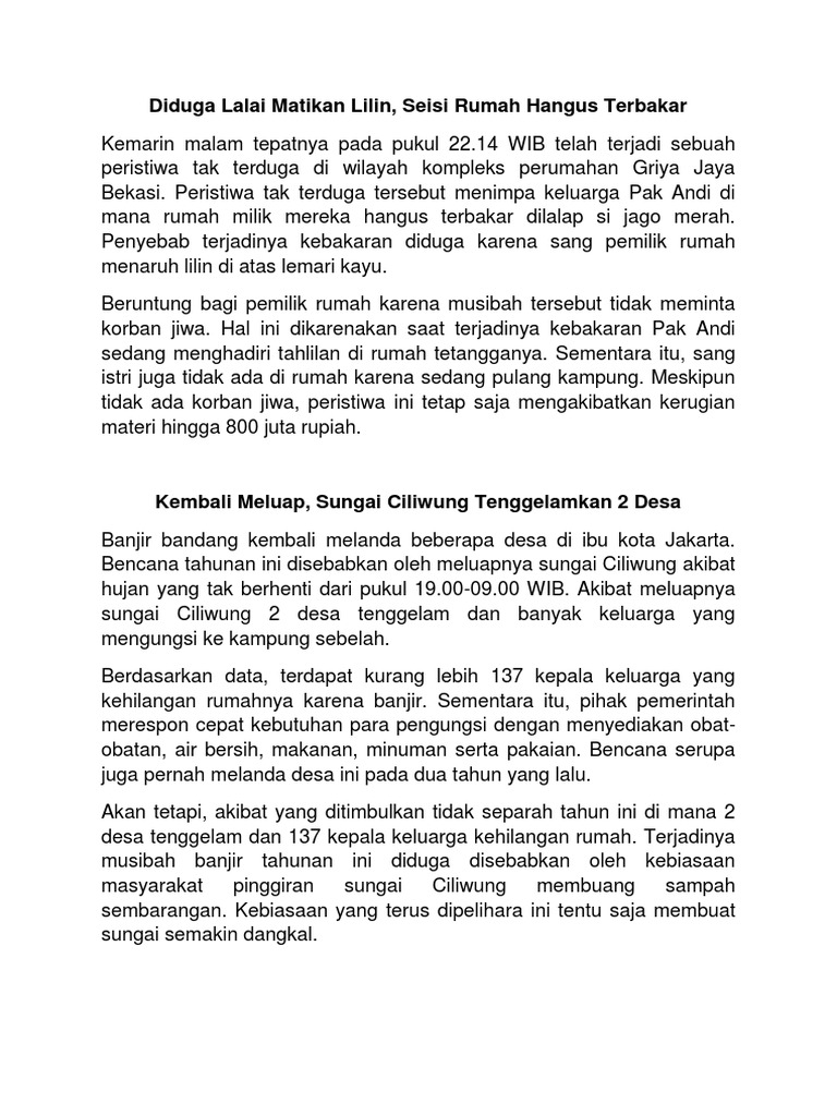 Anak anak sd di desa mekar jaya kabupaten muara enim jika pasca turun hujan harus berjuang lebih keras dalam menuntut ilmu mereka harus berjalan kaki tanpa menggunakan sepatu dalam kondisi lumpur dan becek dengan jarak tempuh mencapai 5 km untuk belajar di sekolah dan menggapai cita cita mereka. Lengkap beserta strukturnya 5w1h. Bisa juga disiarkan lewat radio atau televisi. Contoh teks berita tentang banjir. Bahkan dengan kemajuan teknologi seperti saat ini berita juga diunggah pada situs situs di internet. Pada kesempatan ini saya akan memberikan contoh teks berita singkat terbaru yang pernah terjadi di indonesia dan juga berita paling terkini yang tayang di tv yang dijadikan menjadi sebuah teks berita berdasarkan strukturnya dan mengandung kaidah 5w1h.