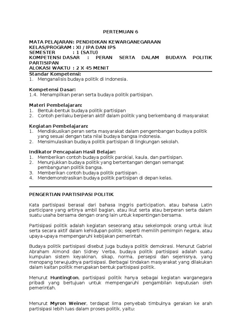 Contoh budaya politik partisipan. Berikut adalah contoh budaya politik partisipan di dalam lingkup keluarga. Budaya politik partisipan merupakan tipe budaya politik ideal di mana dalam budaya politik ini orientasi politik rakyat tidak hanya bersifat kognitif atau afektif saja tetapi sudah merupakan orientasi politik yang bersifat evaluatif yang ditandai dengan dimilikinya kemampuan rakyat dalam menilai dan mengontrol semua kebijakan dari para pmegang kekuasaan. Melakukan musyawarah mufakat untuk menyelesaikan suatu masalah. Budaya politik ini berdasarkan ciri ciri masyarakat yang kemudian berkembang dibagi menjadi 3 yaitu budaya politik parokial atau apatis budaya politik kaula dan budaya politik partisipan. Sebagai warga sekolah yang baik setiap siswa harus aktif mengikuti kegiatan ini. Pengertian budaya partisipan adalah.