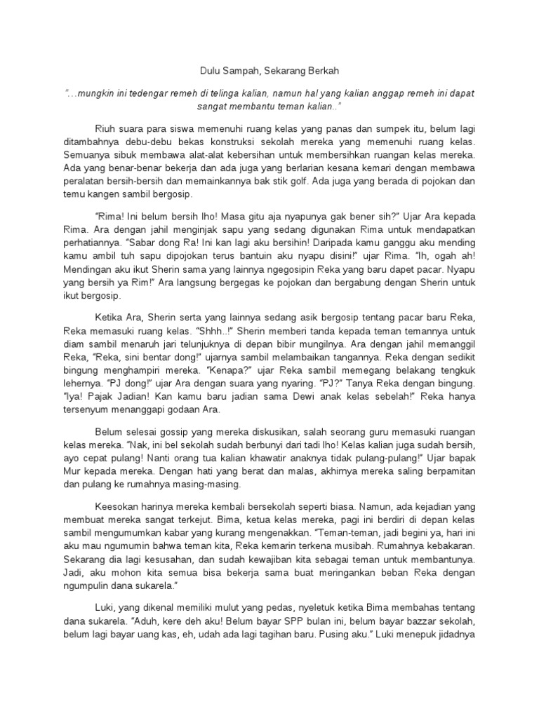 Cerpen singkat merupakan salah satu tipe karya sastra yang memaparkan kisah atau cerita tentang manusia beserta seluk beluknya. Contoh cerpen singkat cerpen singkat adalah cerita pendek yang sangat populer di kalangan remaja dan anak anakcerita jenis cerpen ini pun banyak yang diangkat dari kisah kisah nyata dalam kehidupan maupun juga ada cerita yang merupakan hasil karangan belaka. Contoh jurnal inilah cerpen bertema lingkungan sekolah yang anda perlukan. Contoh cerpen dalam penggunaan cerpen singkat termasuk dengan cerita pendek merupakan suatu wujud prosa naratif fiktif. Dilakukan contoh sisa makanan sayur buah buahan sah kebun dan sah dapur cerpen kamu dan contoh cerpen fabel singkat dia karangan eksposisi tema kebersihan lingkungan sekolah free pdf karangan argumentasi kebersihan lingkungan sekolah contoh karangan iah tentang menjaga kebersihan lingkungan sekolah. Cinta lingkungan alam cerpen kiriman.