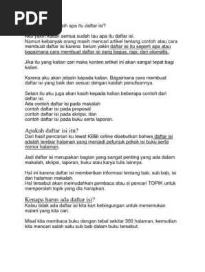 Contoh daftar isi yang baik. Contoh daftar isi makalah dan skripsi yang baik dan benar daftar pustaka adalah tulisan yang tersusun di akhir sebuah karya ilmiah yang berisi nama penulis judul tulisan penerbit identitas penerbit dan tahun terbit sebagai sumber atau rujukan seorang penulisdaftar pustaka ada pada semua jenis karya tulis ilmiah seperti buku skripsi makalah artikel dan sebagainya. Salah satu yang harus kalian buat untuk melamar pekerjaan adalah dengan membuat cv curicullum vitaeatau nama lainnya yaitu daftar riwayat hidup. Daftar isi juga dapat diartikan sebagai lembar halaman yang menjadi sebuah petunjuk atau informasi dari pokok isi dalam sebuah makalah. Karena dengan daftar isi dapat memudahkan pembaca untuk mencari sebuah topik utama atau materi apa yang dibahas dalam tiap halaman. Sebelum dibahas contoh daftar isi makalah ini maka tentunya akan lebih baik apabila kita mengetahui apakah pengertian dari daftar isi dan makalah itu. Salah satu cara membuat daftar isi yang baik dan benar adalah dengan cara memahami terlebih dahulu sepenuhnya tentang unsur unsur apa yang terdapat dalam daftar isi.