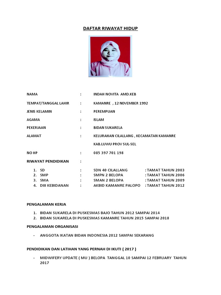Contoh daftar riwayat hidup bidan. Semoga contoh daftar riwayat hidup lamaran kerja 2018 bisa dijadikan rujukan anda dalam membuat sebuah riwayat hidup yang baik dan benar. Contoh daftar riwayat hidup tulis tangan yang baik dan benar. Sebelumnya saya telah memberikan berbagai contoh surat lamaran kerja yang baik dan sebagai pendukung serta kelengkapan kalian dalam melamar kerja kali ini saya akan memberikan. Nah agar tidak bingung dan pusing tujuh keliling untuk urusan yang remeh satu ini kali ini kita akan memberikan contoh daftar riwayat hidup atau contoh cv yang baik dan benar disertai dengan cara membuat dan format daftar riwayat hidup yang biasanya digunakan untuk suatu kegiatan formal maupun melamar sebuah pekerjaan. Apabila anda tidak ingin repot menulis dari awal daftar riwayat hidup anda maka tinggal download saja contohnya berformat word dibawah ini. Biasanya didalam contoh daftar riwayat hidup akan berisi dengan informasi pendidikan keahlian biodata riwayat pekerjaan dan hal lainnya.