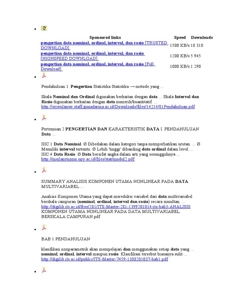 Skala nominal ukuran yang tidak sebenarnya contoh. Kategori data memiliki sifat saling memisah. 30 60 dan 70 derajat celcius maka data tersebut adalah data dengan skala pengukuran interval karena selain dapat dirangking peneliti juga akan tahu secara pasti perbedaan antara satu data dengan data lainnya. Data berskala rasio adalah data yang diperoleh dengan cara pengukuran dimana jarak dua titik pada skala sudah diketahui dan mempunyai titik nol yang absolut. Seperti titik 0 c tentu beda dengan titik 0 f. Pendahuluan fenomena yang sering terjadi ketika mahasiswa ingin menyelesaikan tugas akhir diantaranya adalah ketika menemukan data rasio yang pada gilirannya akan meminta jawaban tentang alat analisis statistik mana yang akan di gunakan.