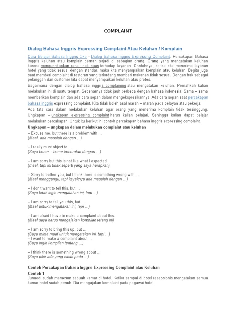Untuk melaporkan ketidaknyamanan dalam menginap di suatu hotel biasanya anda. Penyajian makanan seperti di warung atau lesehancara yang digunakan adalah dengan taking order atau memesan makanan. Contoh dialog handling complaint. 3 contoh surat komplain dalam bahasa inggris dan artinya surat komplain merupakan surat ketidakpuasan terhadap suatu hal. This dialog happened after the guest has ordered the food. Posted by moeday minggu 03 maret 2013 0 comments.