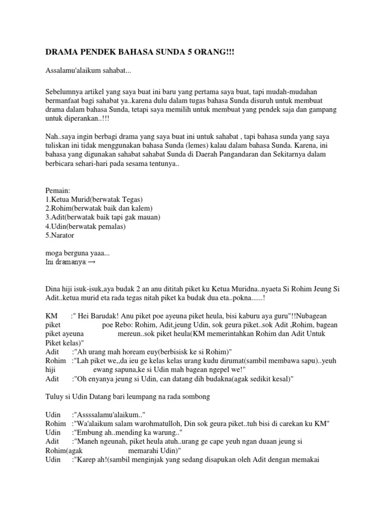 Caranya adalah dengan mengambil naskah drama dalam bahasa indonesia lalu kemudian kita terjemahkan ke dalam bahasa sunda dengan menggunakan website kamus pernerjemah bahasa indonesia ke bahasa sunda. Naskah drama basa sunda. Contoh naskah drama komedi bahasa sunda orang drama orang sunda isu terkini mengenai contoh naskah drama komedi bahasa sunda orang pasti dapat mengetahui seputar kiat yang benar terbaru lainnya merupakan bentuk parodi jika dipahami semoga artikel ini bermanfaat menjadi bikin tertawa free untuk keperluan kamu. 07 jul 2014 04. Karena kami lihat banyak sekali pencarian dengan kata kunci contoh cerkak dalam bahasa. Drama bahasa sunda 7 orang.
