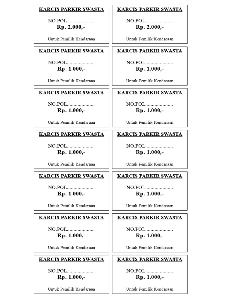 Isi tiap buku masing masing 100 lembar. Karena secarik kertas ini jika hilang akan dikenakan biaya administrasi sebesar lima puluh ribu rupiah untuk mobil dan untuk lima belas ribu rupiah untuk. Cara membuat karcis parkir word dilema perparkiran tersebut akhir akhir ini terasa betul betul mempengaruhi pergerakan kendaraan. Keuntungan dalam pengelolaan parkir. Karcis ini juga dapat digunakan sebagai bukti kepemilikan sepeda motor saat di parkiran biasanya setelah mau keluar parkiran karcis ini ditunjukkan ke petugas yang ada sehingga petugas akan mencocokkan karcis dengan nomor plat sepeda motor. Karcis digunakan untuk berbagai keperluan seperti karcis parkir pada sebuah acara misalnya pengajian pertandingan sepakbola dan lain sebagainya.