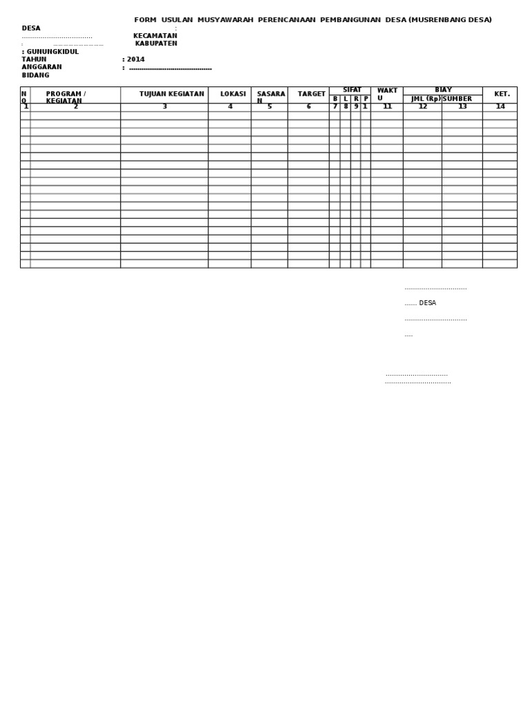 Contoh format usulan musrenbang. Tabel 5 kolom 5 6 dan 7 memperlihatkan contoh format yang dapat digunakan untuk mereview usulan program dan kegiatan skpd serta prioritas tahun rencana berdasarkan prakiraan. Panduan dan administrasi musrenbang desa sebenar format tersebut tidak berbeda dengan format musrenbang desa sebelumnya. Berita acara musrenbang desa berikut ini anda bisa lansung copypaste berita acara musrenbang desa ini untuk kelengkapan administrasi berita acara. Format usulan memperhatikan format rka. Daftar kegiatan kelurahan layang dalam konsep maka. Memasukkan usulan kegiatan hasil musrenbang kecamatan yang terkait dengan skpd ke dalam rancangan renja skpd.