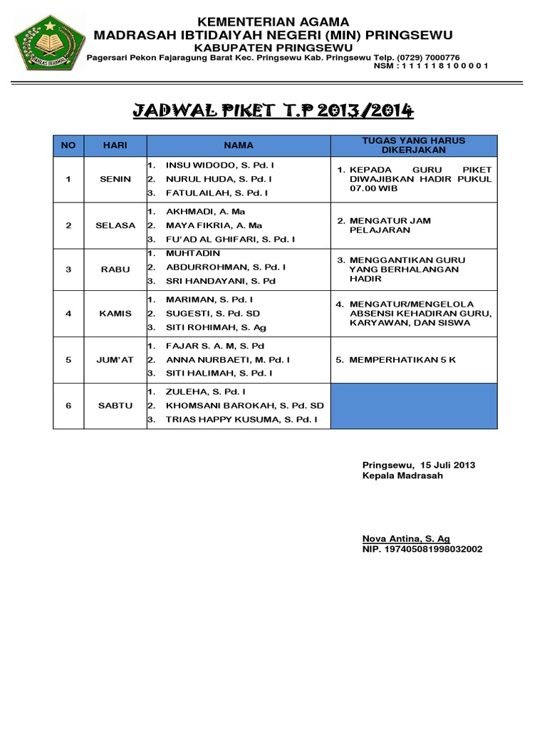 Contoh jadwal piket guru. Jika dalam proses pendonloaddan buku piket guru smpmts ini tidak sesuai atau terjadi masalah silahkan untuk menuliskan saran kritik ya pakbu. File membuat jadwal piket. Kali ini kami bagikan contoh format buku piket guru yang mungkin bisa digunakan untuk melengkapi program kerja guru piket untuk laporan ke kepala sekolah. Yang bisa digunakan untuk melengkapi administarsi guru yang dapat di unduh secara gratis dengan menekan tombol download. Download template jadwal piket kelas contoh jadwal piket kelaspptx downloaded 15922 times 224 kb. Contoh buku piket guru smpmts yang akan bapakibu download ini mudah mudahan sesuai dengan harapan bapakibu dalam menlengkapi perangkat administrasi disekolahnya secara lengkap.