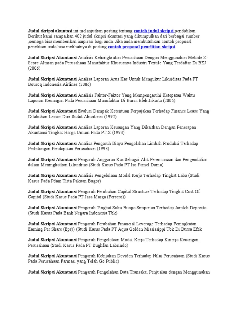 Contoh judul skripsi akuntansi. Sebenarnya judul skripsi mahasiswa yang mengambil jurusan akuntansi keuangan tidak jauh berbeda dengan ketika anda membuat 100 judul skripsi akuntansi perpajakan langsung acc dan juga 150 contoh judul skripsi akuntansi perpajakan s1 terbaru karena memang masih sama sama membahas mengenai ranah akuntansi. Sebagai gambaran untuk memilih judul skripsi berikut ini beberapa ide yang bisa digunakan untuk menentukan judul skripsi akuntnasi yang diinginkan. Akuntansi keuangan semoga bermanfaat. Namun kadang kala masih banyak mahasiswa yag merasa kesulitan menemuka judul skripsi yag hendak diajukan sebagai tugas akhir. Itulah 150 lebih contoh judul skripsi akuntansi keuangan yang dapat dijadikan referensi penyelesaian skripsi kalian. Jadi bagi kamu yang sedang membuat skripsi maka mudah untuk kamu mendapatkan referensi yang diinginkan.