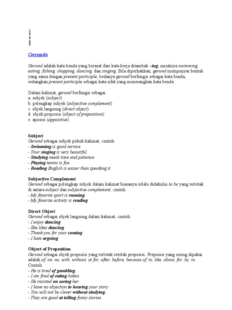 Subject dari sebuah kalimat his hobby is swimming. Sebagai pengenalan berikut merupakan contoh kalimat gerund sebagai kalimat subject complement. I am not smoking. Gerunds dapat menjadi bentuk negative dengan menambahkan not contoh. Abdul enjoys not working. Berlari mungkin sulit bagi sebagian orang direct object.