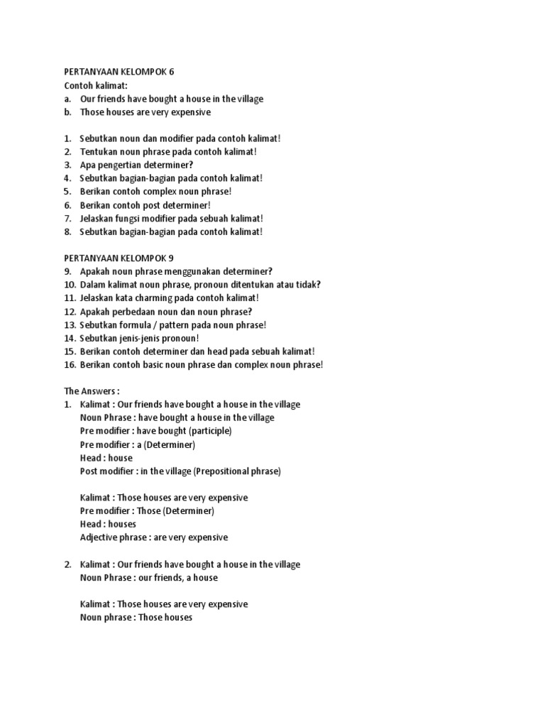 Contoh kalimat noun phrase. The flowers these flowers my flowers some flowers. Berikut ini jenis jenis nound phrase dalam bahasa inggris yang perlu kita pelajari. Penjelasan pengertian materi jenis pola contoh kalimat dan latihan soal dalam bahasa inggris dan artinya pengertian noun phrase noun phrase adalah frasa antara noun pronoun. Berikut ini beberapa contoh kalimat serta fungsinya. Contoh kalimat noun phrase. Rumah ini sangatlah tua my brother is a football player.
