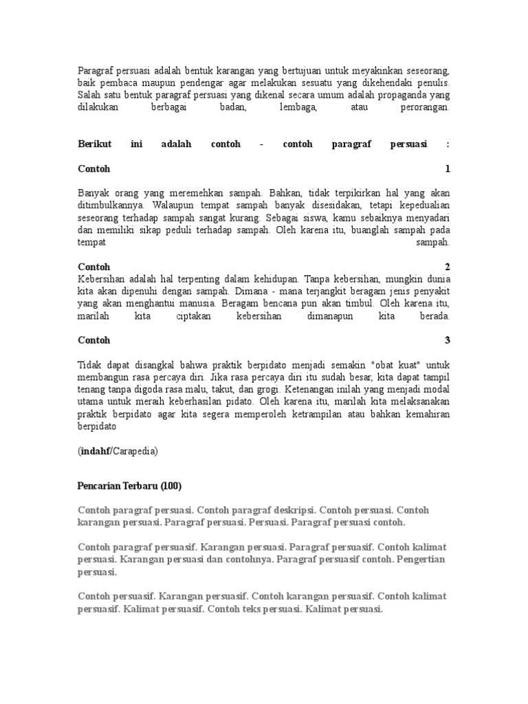 Jenis karangan ini pastinya tidak asing lagi bagi anda yang terjun dalam dunia kepenulisan. Great hotel deals in karangan. Contoh paragraf persuasi tentang agama. Contoh paragraf argumentasi tentang sampah dalam bahasa indonesia salah satu jenis jenis paragraf adalah paragraf argumentasiparagraf ini juga termasuk ke dalam jenis jenis paragraf berdasarkan isinya selain contoh kalimat dan paragraf persuasi paragraf narasi dan paragraf deskripsicontoh paragraf ini pun sudah dibahas sebelumnya yakni contoh paragraf argumentasi tentang lingkungan. Apalagi sejak anak dibangku sekolah sudah diajarkan mengenai jenis karangan atau paragraf persuasi. Contoh paragraf persuasi tentang lingkungan hidup yang baik dan benar berbagai info seputar urt resmi ruhn urt rmhnn urt.