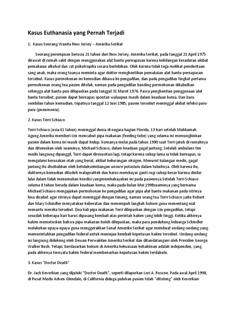 Contoh kasus euthanasia di indonesia. Sabtu 16 okt 2004 1350 wib. Euthanasia pasif adalah di mana ahli medis tidak melakukan tindakan secara langsung untuk mengakhiri hidup pasien tetapi membiarkan pasien tersebut meninggal. Tetapi bagaimanapun karena masalah euthanasia menyangkut soal keamanan dan keselamatan nyawa manusia maka harus dicari pengaturan atau pasal yang sekurang kurangnya sedikit mendekati unsur unsur euthanasia itu. Beberapa kasus eutanasia termasuk indonesia indonesia sebuah permohonan untuk melakukan eutanasia pada tanggal 22 oktober 2004 telah diajukan oleh seorang suami bernama hassan kusuma karena tidak tega menyaksikan istrinya yang bernama agian isna nauli 33 tahun tergolek koma selama 2 bulan dan di samping itu ketidakmampuan untuk menanggung beban biaya perawatan merupakan suatu alasan pula. Dalam sebuah kasus di sekitar 1990 di belanda kata komariah seorang keluarga pasien yang ingin melakukan euthanasia sempat ditolak oleh pengadilan walaupun akhirnya dikabulkan. Tetapi berbeda di negara indonesia euthanasia hakikatnya dilarang keras bahkan diancam hukuman 12 tahun penjara jika melakukan tindakan yang mengakibatkan hilangnya nyawa seseorang walaupun hal itu diminta oleh pasien tanpa keterpaksaan atau dengan ketulusan hati euthanasia.