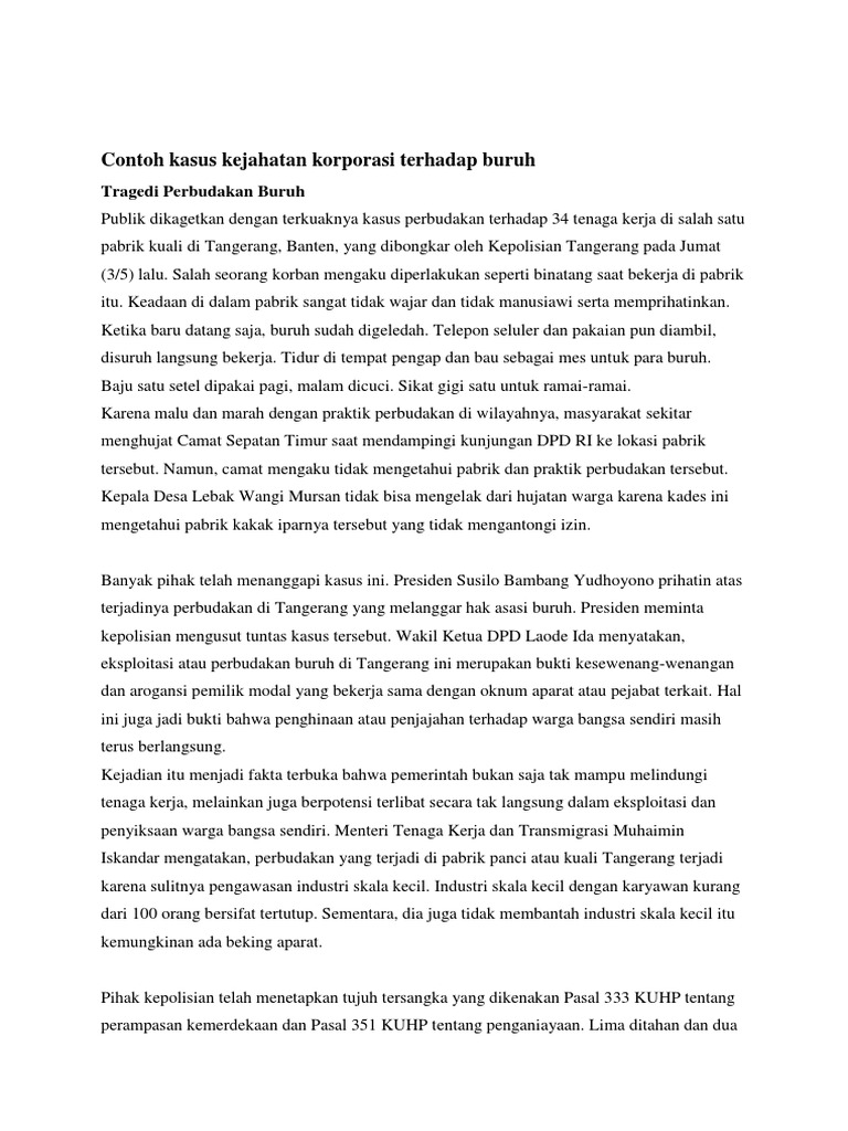 Contoh kasus kejahatan korporasi. Surabaya agung industri pulp dan kertas saipk. Apabila tindakan penipuan biasanya hanya menguntungkan seorang individu saja dalam kejahatan ini kecurangan dilakukan untuk mencapai tujuan atau keuntungan tertentu bagi perusahaan. Kejahatan korporasi merupakan salah satu contoh kasus pelanggaran ham berat yang harus dijauhi oleh semua orang. Hal ini dilakukan untuk menciptakan ruang bagasi yang lebih besar. Kasus lainnya tentang sistem kejahatan yang dapat dikatakan korporasi ialah prwitiwa yang baru baru ini terjadi misalnya saja tentang penipuan atas nama perusahaan jawa umroh dan haji yang pernah dilakukan fist travel pada tahun 2018. Jakarta direktorat tindak pidana ekonomi khusu eksus bareskrim polri membidik kejahatan korporasi dalam kasus korupsi restitusi pajak.