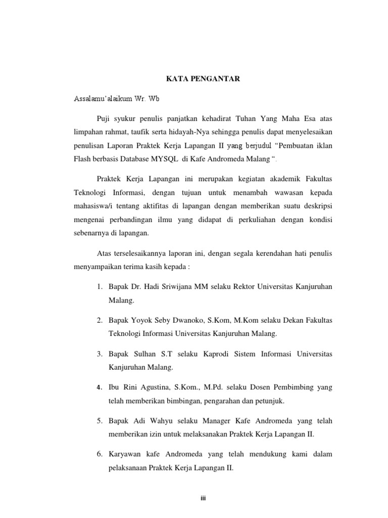 Contoh kata pengantar laporan bagi mahasiswa dan pelajar membuat kata pengantar untuk tugas laporan adalah hal yang sangat penting. Contoh kata pengantar laporan pkl industri ketika seseorang sudah menyelesaikan tugas magang di industri mereka tentu akan diminta untuk membuat sebuah laporan yang digunakan sebagai bukti bahwa yang bersangkutan benar benar menyelesaikan tugas magangnya. Contoh kata pengantar laporan pkl. Contoh kata pengantar prakerin. Tentunya bukan dalam laporan saja kata pengantar juga ada sistematikanya dan cara membuat contoh kata pengantar prakerin yang baik dan benartidak sembarang dalam penulisan tersebut misalnya harus ada beberapa kalimat yang mengucapkan rasa syukur kepada tuhan yang maha esa ucapan terimakasih kepada pembaca dan semua pihak yang telah membantu dalam penulisan karya ilmiah laporan praktek. Contoh kata pengantar laporan prakerin smk yang baik dan benarprakerin adalah singkatan dari praktek kerja industri instansi.