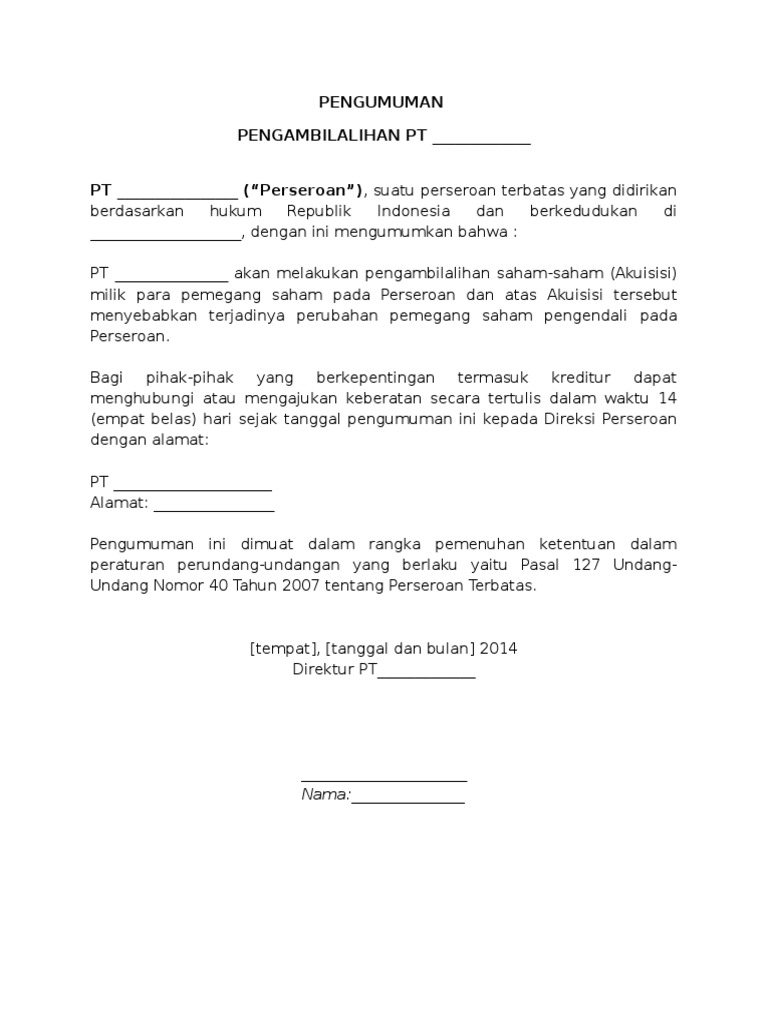 Contoh keputusan sirkuler pemegang saham. Naviriorg berikut ini adalah contoh akta perjanjian seputar rups rapat umum pemegang saham mengenai pernyataan keputusan rapat. Berdasarkan pasal 102 undang undang nomor 40 tahun 2007 tentang perseroan. Contoh keputusan sirkuler pemegang saham shareholder approval billingual english indonesian contoh keputusan sirkuler pemegang saham shareholder approval dalam setiap tindakan hukum yang akan mempengaruhi setiap harta dan kekayaan perusahaan perlu mendapatkan apa yang disebut dengan persetujuan pemegang saham atau dalam bahasa bisnis sehari hari sering disebut dengan shareholder. Contoh ini hanya draft yang bisa diubah atau ditambahdikurangi sesuai keperluan. Pernyataan keputusan sirkuler para pemegang saham. F keputusan sirkuler ini dapat ditandatangani dalam beberapa lembar asli terpisah yang secara.