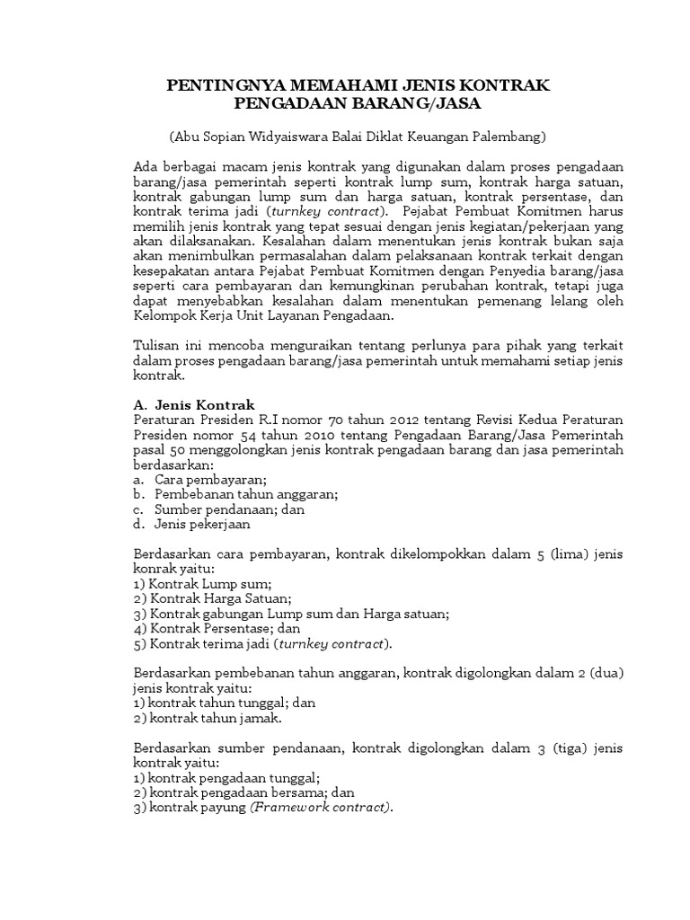 Format tersebut dibuat berdasarkan peraturan presiden nomor 70 tahun 2012 tentang perubahan kedua atas perpres nomor 54 tahun 2010 tentang pengadaan barangjasa pemerintah dan perka lkpp nomor 15 tahun 2012 tentang standar dokumen pengadaan barangjasa pemerintah. Kontrak berdasarkan peraturan presiden nomor 16 tahun 2018 tentang pengadaan barangjasa pemerintah. Setiap benda baik berwujud maupun tidak berwujud bergerak maupun tidak bergerak yang dapat diperdagangkan dipakai. Misal kontrak mengacu kepada perpres 54 tahun 2010 atau perpres 70 tahun 2012. Bila kontrak tidak mengungkapkan dengan jelas maka mengacu kepada dasar hukum atau waktu pembuatan kontrak. Pemutusan kontrak dilakukan berdasar klausul yang ada dalam kontrak.