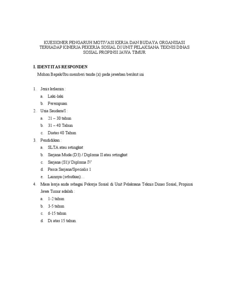 Demikian ulasan mengenai contoh kuesioner sekaligus berbagai penjelasan lengkapnya. 21 30 tahun b. Bapakibu disertai dengan permohonan maaf karena kehadiran kuesioner ini akan mengganggu waktu kerja dan istirahat bapakibu. Untuk kalian yang tidak mau ambil pusing membuat baru berikut ini kami akan sediakan contoh kuesioner penelitian file doc yang bisa kamu unduh dan diubah sesuai dengan kebutuhan. Kuesioner pengaruh motivasi dan lingkungan kerja terhadap kinerja karyawan. Terhadap kinerja pekerja sosial di unit pelaksana teknis dinas sosial propinsi jawa timur i.