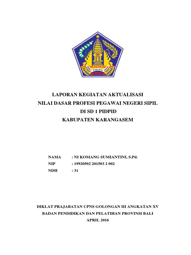 Laporan aktualisasi nilai nilai dasar profesi pns diklat prajabatan golongan iii i. Ari yanto spd nip. 32 4 jabatan. Penulis menyadari bahwa laporan aktualisasi ini masih terdapat kekurangan karena terbatasnya kemampuan dan pengetahuan penulis. Ada 3 tahapan yang dilalui ketika diklat latsarprajabatan. Laporan aktualisasi nilai nilai dasar profesi pns pamong budaya di balai pelestarian nilai budaya yogyakarta ini merupakan salah satu perwujudan proses pembelajaran nilai dasar profesi pns.