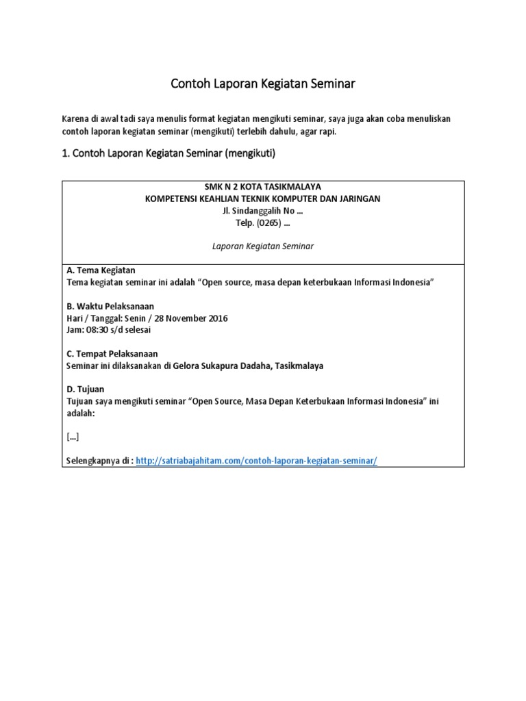 Seminar nasional yang terselenggara pada kamis 15 desember 2016 berjalan dengan lancar. Laporan tersebut berfungsi sebagai bentuk tanggung jawab sekaligus bukti bahwa seseorang sudah mengikuti kegiatan. Pembawa acara membuka acara dengan baik. Contoh laporan kegiatan seminar laporan kegiatan seminar merupakan salah satu bentuk pertanggung jawaban yang biasanya dibuat sebagai bukti bahwa kita sebagai pembuat laporan benar benar telah melakukan atau mengikuti apa yang tertulis di dalam laporan tersebut yang dalam hal ini adalah kegiatan seminar. Susunan panitia b. Latar belakang seminar b.