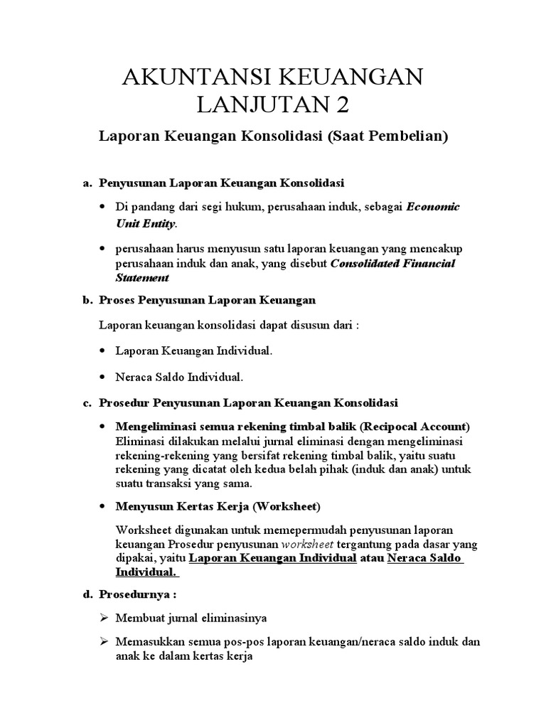 Konsolidasi dalam akuntansi yaitu penggabungan laporan semua aset ekuitas kewajiban dan akun operasional perusahaan induk dan anak perusahaan menjadi satu laporan keuangan. Suatu perusahaan menjadi perusahaan anak ketika perusahaan lain disebut sebagai perusahaan induk memperoleh pengendalian kepemilikan atas saham berhak suara yang bereda. Konsolidasi dalam sosiologi yang merupakan bentuk penguatan keanggotaan masyarakat dalam kelompok sosial yang terdiri dari berbagai elemen seperti agama etnis status sosial gender dan lain lain. Prosedur konsolidasi diatur dalam psak no. Laporan keuangan untuk entitas gabungan disusun dengan mengkonversi laporan keuangan perusahaan induk dan anak menjadi laporan konsolidasi yang merefleksikan posisi keuangan dan hasil operasi entitas gabungan. Pelaksanaan penggabungan usaha melalui akuisisi saham.