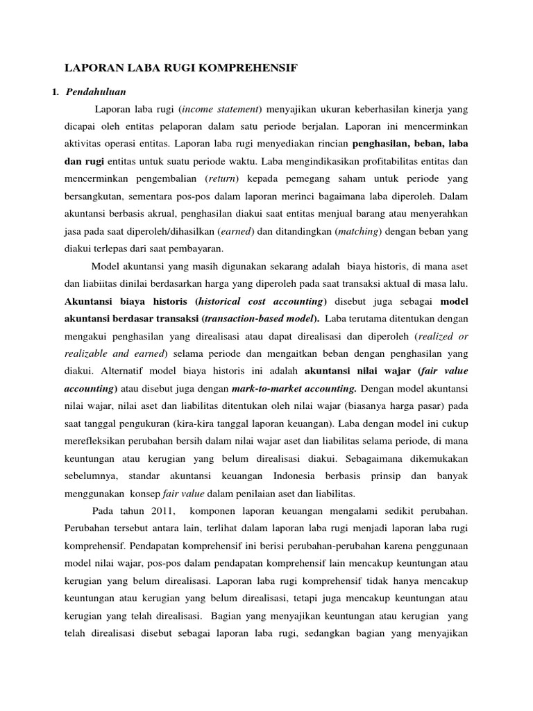 Contoh laporan laba rugi komprehensif. Pada tahun 2011 komponen laporan keuangan mengalami sedikit perubahan. Contoh laba komprehensif unsur laba seperti ini tidak dimasukkan ke dalam laba bersih karena dianggap memberikan sedikit informasi tentang kinerja ekonomi dari operasi normal perusahaan. Perusahaan publik tbk wajib menyajikan seluruh pendapatan dan beban yang diakui dalam suatu periode dalam satu laporan laba rugi komprehensif. Laporan laba rugi profit and lost statement yang disusun oleh perusahaan mempunyai unsur pendapatan serta seluruh beban pada periode berjalan suatu perusahaanselengkapnya tentang laporan laba rugi laporan laba rugi adalah laporan yang menunjukkan jumlah pendapatan dan biaya dalam satu periode usahabisnis. Pendapatan komprehensif ini berisi perubahan perubahan karena penggunaan model nilai wajar pos pos dalam pendapatan komprehensif lain mencakup keuntungan atau kerugian yang belum direalisasi. Ada 2 komponen laporan laba rugi komprehensif yaitu.