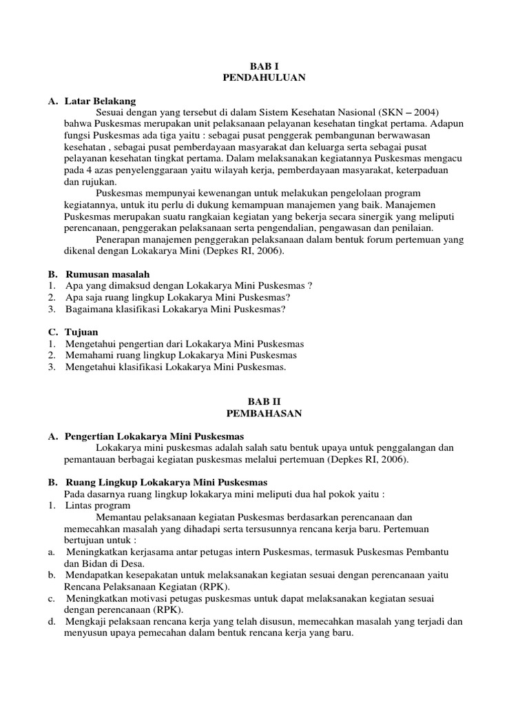 Lokakarya mini puskesmas merupakan suatu pertemuan antar petugas puskesmas dan petugas puskesmas dengan sektor terkait lintas sektoral untuk meningkatkan kerjasama tim memantau cakupan pelayanan puskesmas serta membina peran serta masyarakat secara terpadu agar dapat meningkatkan fungsi puskesmas. Pendahuluan dalam sistem kesehatan nasional skn 2004 bahwa puskesmas merupakan unit pelaksana pelayanan kesehatan tingkat pertama. Menurut tahapan kegiatannya lokakarya mini bulanan puskesmas diselenggarakan dalam 2 dua tahap yaitu. Sebagimana tercantum pada pedoman perencanaan tingkat puskesmas. Demikian laporan loka karya mini bulanan puskesmas mamsena bulan juli tahun 2011 ini dibuat dan digunakan sebagai acuan untuk pelaksanaan kegiatan selanjutnya. Penerapan manajemen penggerakan pelaksanaan dalam bentuk forum pertemuan yang.