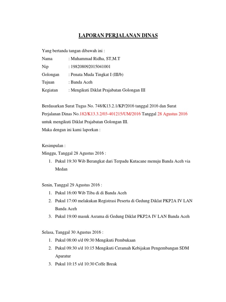 Contoh laporan perjalanan dinas sederhana. Nah dibawah ini adalah salah satu contoh dari tata penulisan yang baik dan benar dalam sebuah surat perjalanan dinas dimana terjadi di sebuah perusahaan swasta misalkan dikantor kantor atau pt swasta lainya dimana surat perintah perjalanan akan dikeluarkan pada umumnya oleh seorang direktur pimpinan. Laporan hasil perjalanan dinas i. Contoh surat perintah perjalanan dinas. Asam kampung lab. 170 jakarta surat perja. Hal ini dilakukan untuk kunjungan antar kota bahkan antar negara.