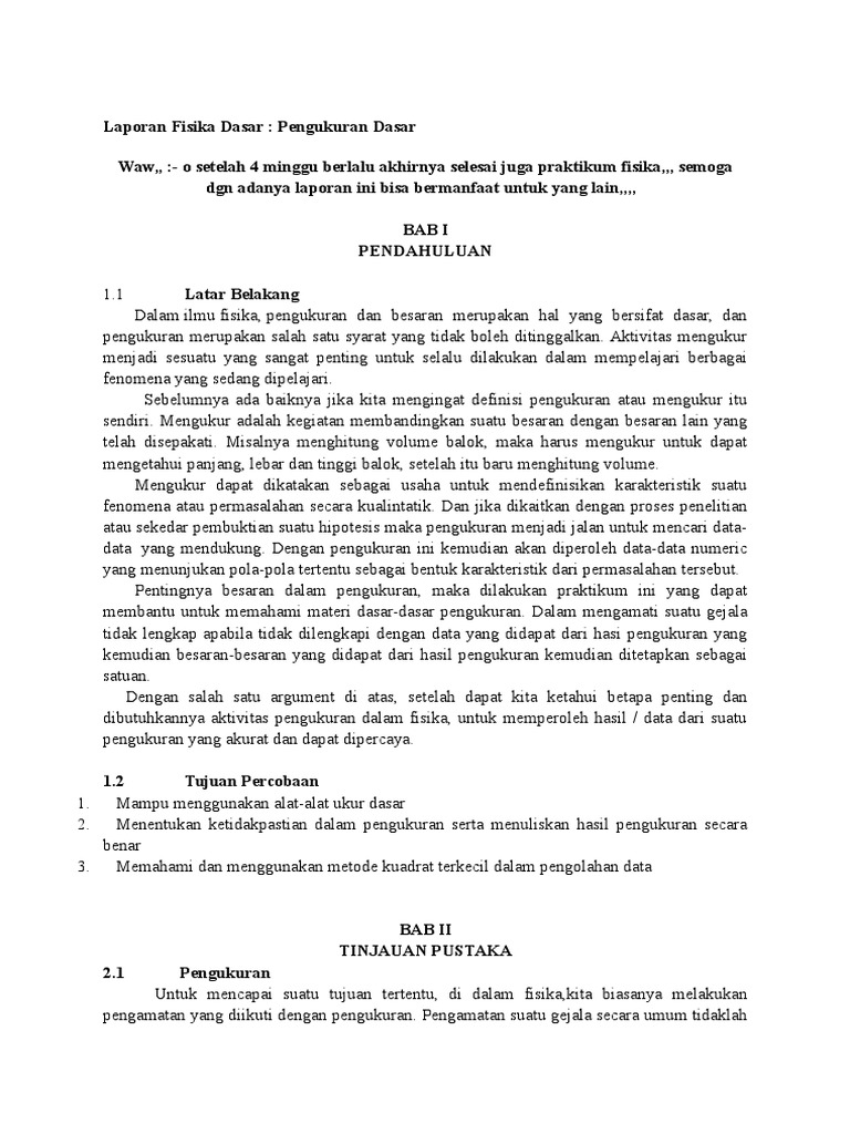 Prinsip dasar pengukuran dan ketidakpastian. Academiaedu is a platform for academics to share research papers. Laporan praktikum fisika penerapan hukum newton i ii dan iii pada roket air guru pembimbing hj. Oleh sebab itu siswa dituntut untuk bisa melakukan praktikum dengan cara yang baik dan benar sesuai prosedur yang berlaku. Home praktikum fisika laporan praktikum pengukuran fisika. Contoh laporan praktikum fisika dasar pelajaran fisika di sekolah pasti tak pernah lepas dari yang namanya praktikum.