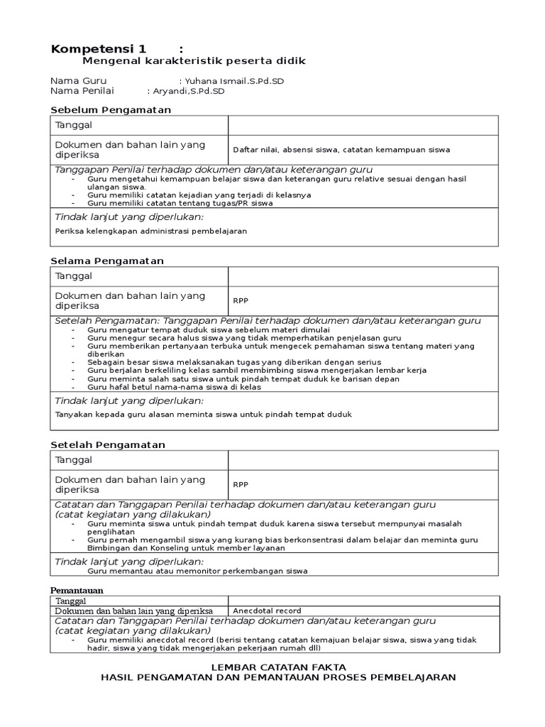 Hasil pekerjaan siswa karya lembar jawaban lks worksheet yang sudah diisi laporan praktikum dll lembar observasi rubrik yang sudah diisi. Pengamatan adalah kegiatan untuk menilai kinerja guru melalui diskusi sebelum pengamatan pengamatan selama pelaksanaan proses pembelajaran dan diskusi setelah pengamatan. Instrumen supervisi akademik yang digunakan sudah memenuhi standar. Lembar catatan fakta pkg merupakan lembar yang dibuat atau diisi oleh penilai pada saat melakukan pengamatan. Pengamatan adalah kegiatan untuk menilai kinerja guru melalui diskusi sebelum pengamatan pengamatan selama pelaksanaan proses pembelajaran dan diskusi setelah pengamatan. Lembar catatan fakta manual 1 lembar catatan fakta hasil pengamatan dan pemantauan proses pembelajaran mohon diisi dengan tulisan tangan dengan jelas lembar ke 1 nama guru yang dinilai.