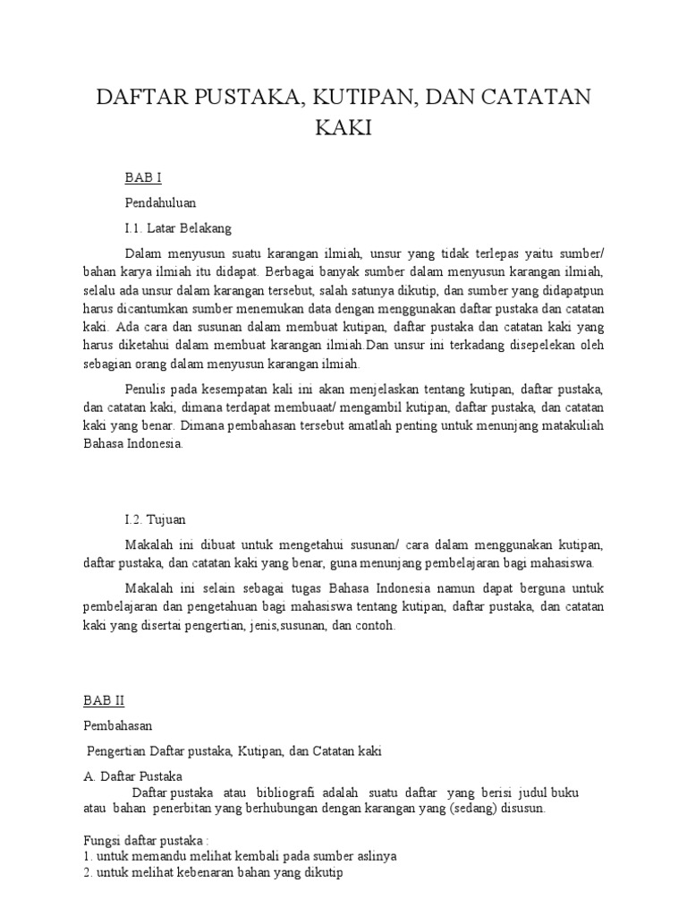 Contoh makalah yang ada catatan kaki daftar pustaka. Dengan demikian ia terhindar dari ketergelinciran pada maksiat kelemahan kemiskinan dan terpecah belah. Yang dimaksud dengan catatan kaki ialah daftar keterangan khusus yang ditulis pada bagian paling bawah disetiap lembaran akhir bab karya ilmiah makalah skripsi tesis dll atau catatan kaki merupakan keterangan referensi yang ditempatkan pada kaki tulisan. Makalah ini berisikan tentang informasi tentang catatan kaki dan daftar pustaka. Selengkapnya bisa mengunjungi halaman. Karena penulisan pada karya ilmiah sudah diatur lengkap sesuai dengan peraturan penulisan di indonesia.