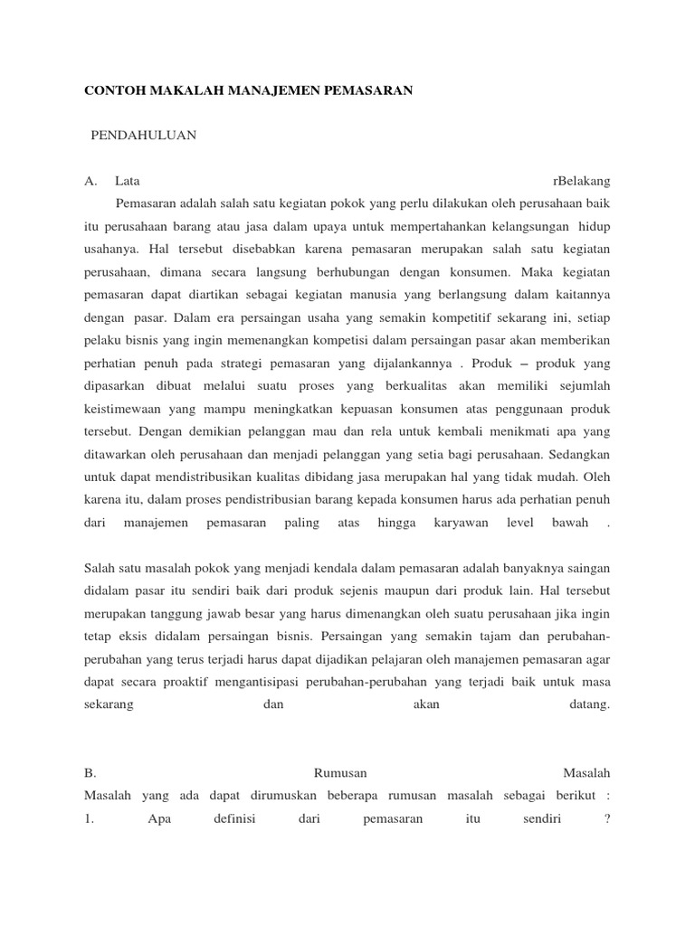 Contoh makalah manajemen pemasaran ini merupakan bagian dari langkah kongkret dalam memperluas wacana pendidikan dan ilmu pengetahuan khususnya ilmu sosial di bidang ekonomi manajemen. Makalah ini disusun berdasarkan analisis kualitatif dengan berdasar pada fakta dan sumber terpercaya sebagai bahan saduran untuk memperluas konsep berfikir dalam penyususnan makalah ini. Academiaedu is a platform for academics to share research papers. Atau anda pernah mengetahui contoh skripsi manajemen pemasaranpada dasarnya kedua hal tersebut memiliki tujuan yang sama jika kita lihat atau ambil pendapat secara umum yakni digunakan untuk memenuhi tugas yang harus dikerjakan oleh. Adalah suatu usaha untuk merencanakan mengimplementasikan yang terdiri dari kegiatan mengorganisaikan mengarahkan mengkoordinir serta mengawasi atau mengendalikan kegiatan pemasaran dalam suatu organisasi agar tercapai tujuan organisasi secara efesien dan efektif. Dari pembahasan makalah ini kita dapat mengambil suatu kesimpulan bahwa untuk dapat memenangkan persaingan dalam pemasaran terlebih dahulu manajemen pemasaran harus mengetahui situasi apa yang sedang dialami oleh perusahaan sebelum menentukan strategi apa yang yang cocok digunakan untuk menghadapi situasi tersebut.