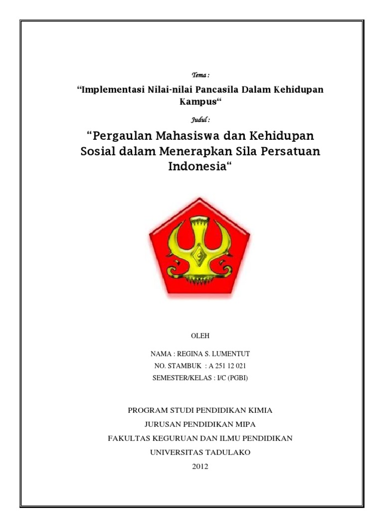 Renuceo bagi anda yang masih duduk di bangku sekolah atau perguruan tinggi seringkali akan mendapatkan tugas yang disajikan dalam bentuk makalah. Demikian halnya dengan terbentuknya negara kesatuan republik indonesia termasuk di dalamnya pancasila sebagai dasar negaranya. Makalah ini dibuat agar kita senantiasa mencintai menghayati dan mengaktualisasi nilai nilai pancasila dalam kehidupan kita sehari hari terutama di lingkungan kampus. Atas ilustrasi tersebut dalam hasil pengamatan ini diharapkan dapat memberikan contoh perilaku masyarakat di sekitar tempat tinggal apa saja sikap yang sudah di lakukan sesuai nilai nilai pancasila maupun yang tidak sesuai dengan. Mahasiswa yang merupakan pejuang perubahan pengamalan pancasila yang lebih baik yang seharusnya menggerakkan penerapan pancasila kini mulai hilang semangatnya. Sehingga kelak saat kita terjun ke masyarakat kita akan menjadi manusia pancasila yakni manusia yang selalu berpedoman teguh pada pancasila.