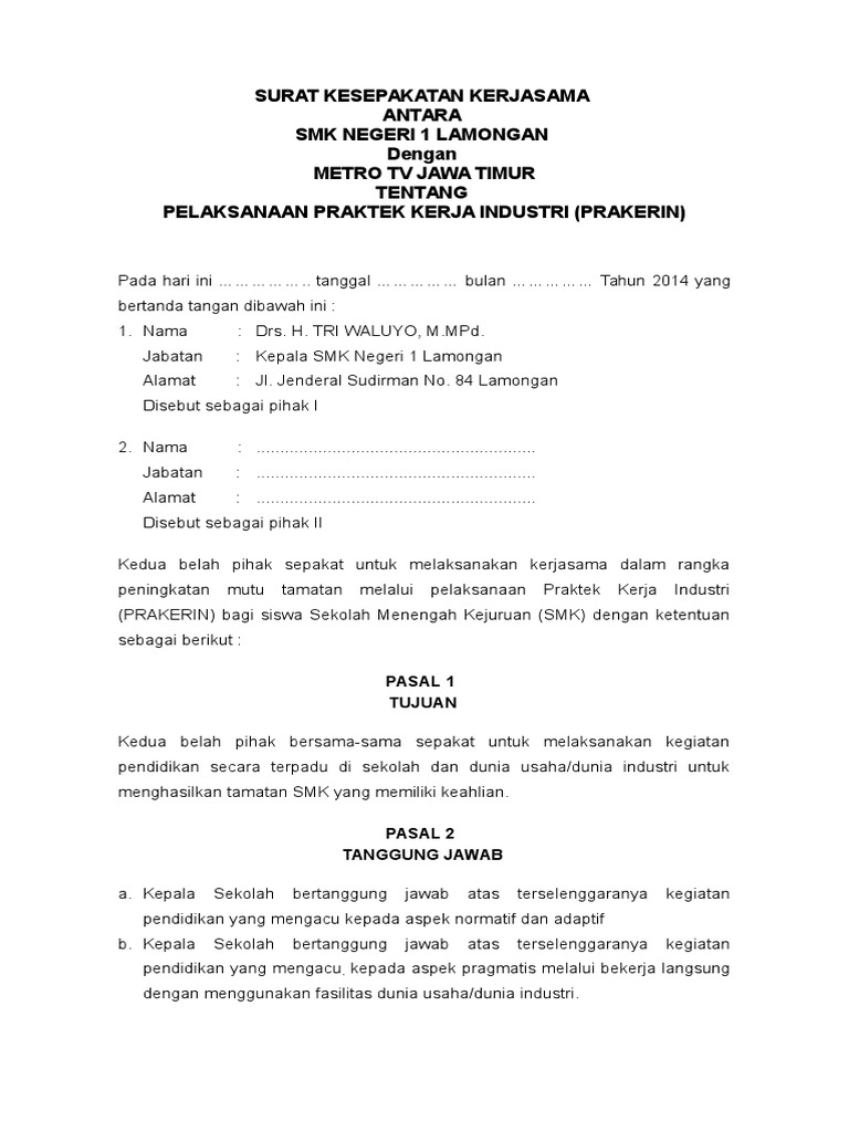 Contoh surat perjanjian kerjasama sekolah dengan puskesmas guru gaul 01 february 2014 perjanjian kerjasama. Dimana usaha yang dibutuhkan tergantung dari kebutuhan sekolah itu sendiri. Pihak sekolah yang akan mengirimkan siswanya untuk melakukan praktek kerja industri prakerin tentunya harus mengikat diri dalam sebuah kesepakatan mou dengan perusahaan yang menampung siswa praktek tersebut. Perjanjian antar dua pihak ini biasa dikenal dengan istilah memorandum of understanding mou. Karena memang sekarang ini banyak sekali sekolah yang bekerja sama dengan pihak yang memiliki usaha. Contoh mou sekolah dengan dunia usaha surat mou atau surat kerja sama sekolah dengan dunia usaha saat ini memang banyak di cari.