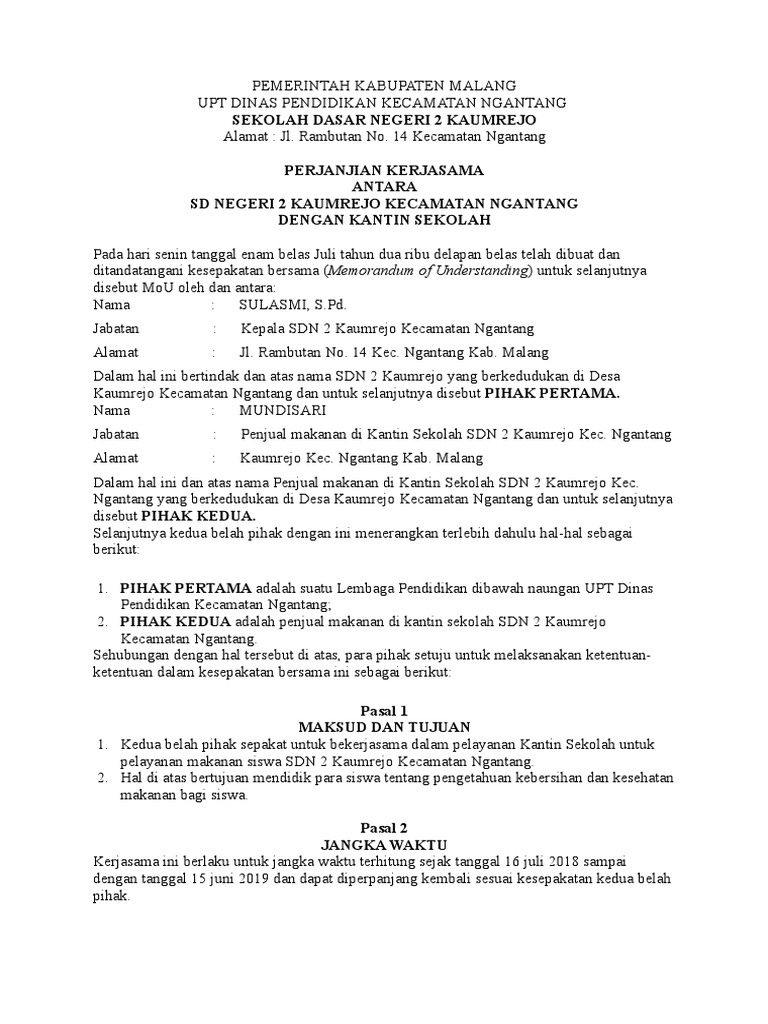 Mou berisikan tentang hal hal yang diutamakan atau pokok. Kumpulan contoh surat lamaran kerja contoh surat mou kantin sekolah surat dinas resmi contoh surat mou kantin sekolah surat izin pernyataan. Academiaedu is a platform for academics to share research papers. Dawe lor desa ngelo kec. Pelaksanaannya diatur secara bertahap terencana terarah dan berkelanjutan sesuai dengan tuntutan perubahan kehidupan lokal nasional dan global. 3200000 tiga juta dua ratus ribu rupiah kontan selama 2 dua tahun terhitung mulai tanggal 27 januari 2014 sd 27 januari 2016.