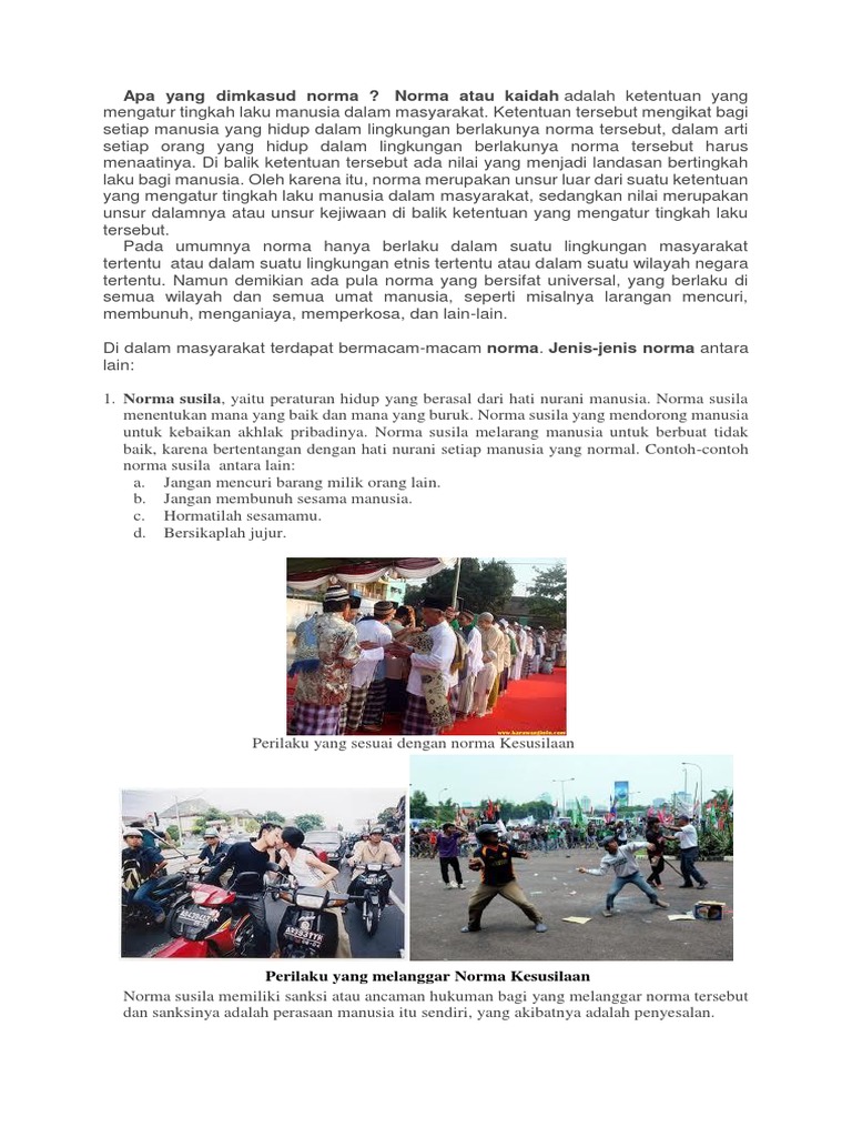 Oleh karena itu bersama kelompokmu diskusikan contoh contoh penerapan norma agama kesusialan kesopanan dan norma hukum dalam lingkungan keluarga sekolah dan lingkungan masyarakatnegara. Contoh norma kesopanan didalam lingkungan masyarakat didalam bersosialisasi di lingkungan masyarakat kita harus pandai untuk memahami mana yang dianggap sopan dan mana yang dianggap tidak sopan oleh sekelompok masyarakat setempat. Contoh penerapan kebiasaan dalam lingkungan keluargasekolahdan masyarakat 3. Norma ini mengharuskan penganut suatu agama untuk menaati semua yang diperintahkan dan dilarang agama sifatnya mutlak dan tidak dapat ditawar tawar atau diubah. Pada umumnya norma hanya berlaku dalam suatu lingkungan masyarakat tertentu atau dalam suatu lingkungan etnis tertentu atau dalam suatu wilayah negara tertentu. Contoh penerapan adat istiadat di lingkungan masyarakat 4.