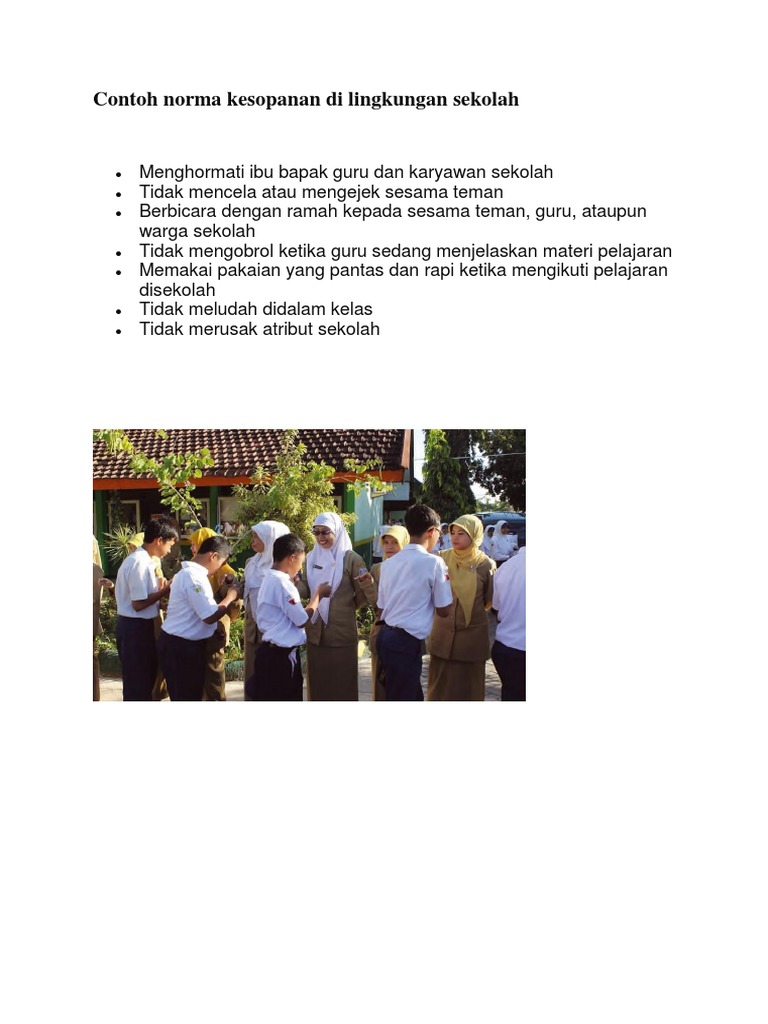 Contoh norma kesopanan di sekolah. Saling tolong menolong antar teman. Adalah peraturan hidup yang timbul dari hasil pergaulan sekelompok itunorma kesopanan bersifat relatif artinya apa yang dianggap sebagai norma kesopanan berbeda beda di berbagai tempat lingkungan atau waktu. Tidak mengobrol saat guru sedang menerangkan materi pelajaran. Contoh norma kesopanan di sekolah. Melerai saat teman. Tidak mencela atau mengejek sesama teman.