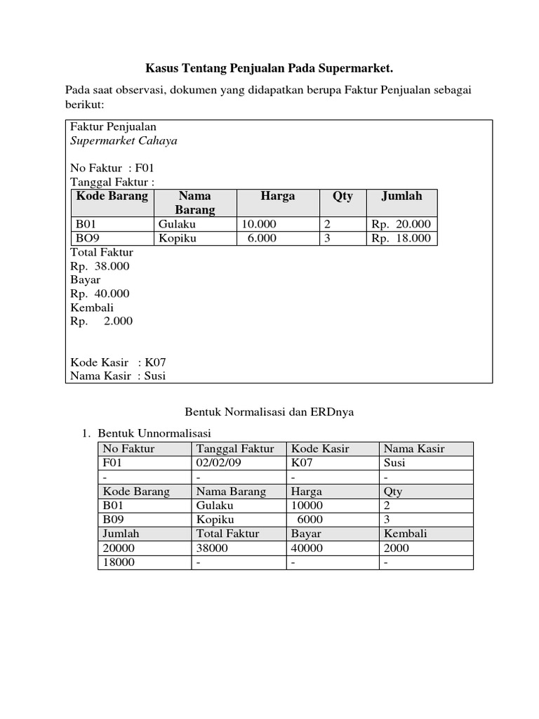 Contoh normalisasi database penjualan. Normalisasi merupakan teknik analisis data yang mengorganisasikan atribut atribut data dengan cara mengelompokkan sehingga terbentuk entitas yang non. Dalam contoh normalisasi faktur pembelian barang gawe cv telah memilihkan tema atau template yang terbaik untuk dijadikan inspirasi ide ataupun acuan dalam penulisan surat anda. Pengertian normalisasi data base dan contoh normalisasi. Untuk memberi nama database tidak diperbolehkan memakai spasi jika ingin memberi jedah gunakan untuk memisahkan nama file tersebutcontohdatabaseanakida04 atau databaseanakida04. Tugas normalisasi imaika penjualan komputer 1. Nirmalisasi database 1nf rudiawan16 dari manual bon pembelian diatas kita dapat menjadi bentuk normal pertama dengan memisah misahkan data pada atribut atribut yang tepat dan bernilai atomik juga seluruh record baris harus lengkap adanya.