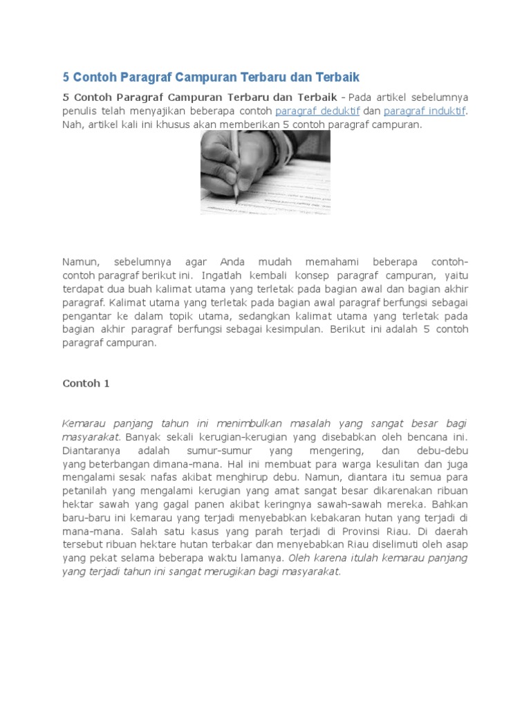 Contoh paragraf deduktif induktif dan campuran 17 mei 2020 14 mei 2020 oleh bagus al menurut letak gagasan utamanya paragraf terbagi menjadi 3 yaitu paragraf deduktif induktif dan campuran. Contoh paragraf deduktif induktif dan campuran paragraf menentukan runut tidaknya dan sistematisnya suatu tulisan. Pengertian paragraf deduktif induktif dan campuran paragraf merupakan rangkaian kalimat yang membentuk satu gagasan pokok. Paragraf deduktif induktif dan campuran paragraf merupakan sebuah susunan dari beberapa kalimat yang mengandung sebuah gagasan. Berikut ulasannya biar tambah berkah jangan lupa baca basmallah dulu sebelum membaca. Menurut kamus besar bahasa indonesia kbbi paragraf adalah bagian bab dalam suatu karangan yang biasanya mengandung satu ide pokok dan penulisannya dimulai dengan garis baru.