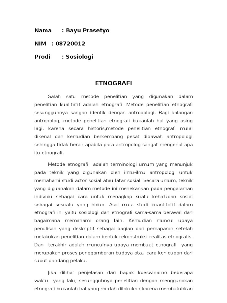 Contoh penelitian etnografi pdf. Etnografi sebagai metode penelitian telah dikembangkan sejak abad ke 20 di bidang sosiologi dan antropologi budayasebagai metode penelitian etnografi adalah penelitian kualitatif tipikal. Penelitian ini bertujuan mendeskripsikan. Etnografi ialah jenis metode penelitian yang diterapkan untuk mengungkap makna sosio kultural dengan cara mempelajari keseharian pola hidup dan interaksi kelompok sosio kultural culture sharing group tertentu dalam ruang atau konteks yang spesifik. Penelitian etnografi memiliki keunggulan dibandingkan dengan penelitian yang lain kekuatan etnografi oleh anne suryani 2008 124 dijelaskan bahwa etnografi menyediakan kesempatan yang lebih dalam mengumpulkan data yang komplet dan relevan dalam menjawab permasalahan karena penelitian etnografi ini mengadakan penelitian secara mendalam dan bersifat partisipan. Apa itu metode penelitian etnografi.