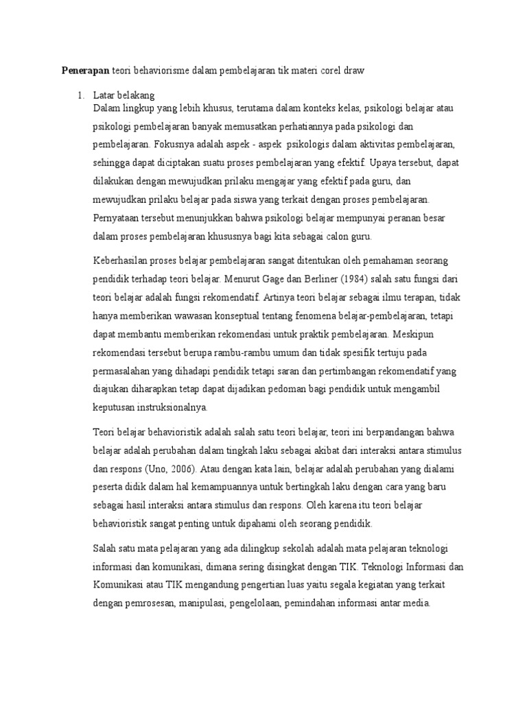 Kita perlu memahami teori teori belajar salah satunya adalah teori belajar behavioristik. Teori belajar kognitif lebih mementingkan proses belajar daripada hasil belajarnya. Teori belajar behavioristik adalah salah satu teori yang menyatakan bahwa terbentuknya perilaku baru disebabkan dari hasil belajarnya atau pengalamannya bukan. 23 penerapan teori behavioristik dalam mata pelajaran bahasa indonesia bagi anak sekolah dasar aplikasi teori behavioristik dalam kegiatan pembelajaran tergantung dari beberapa hal seperti. Teori behavioristik terhadap pembelajaran siswa di sekolah dasar. Teori belajar kognitif adalah teori yang menjelaskan proses pemikiran dan perbedaan kondisi mental serta pengaruh faktor internal dan eksternal dalam menghasilkan belajarnya seorang individu.
